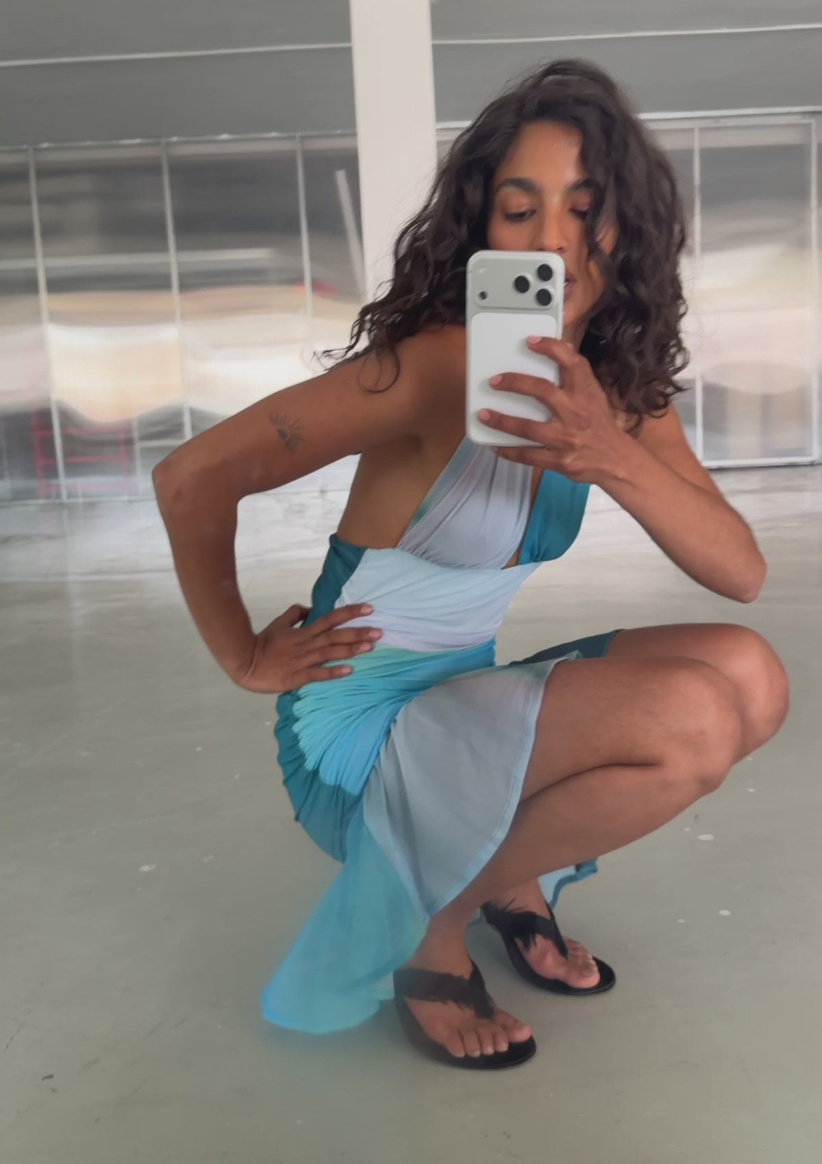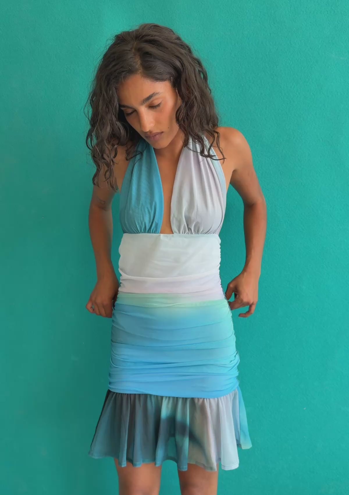 The Solita Dress is crafted in lightweight mesh with a halter neckline and an open back that ties delicately at the neck. It features a softly draped bodice that enhances the silhouette, while the fitted shape gently contours the body.