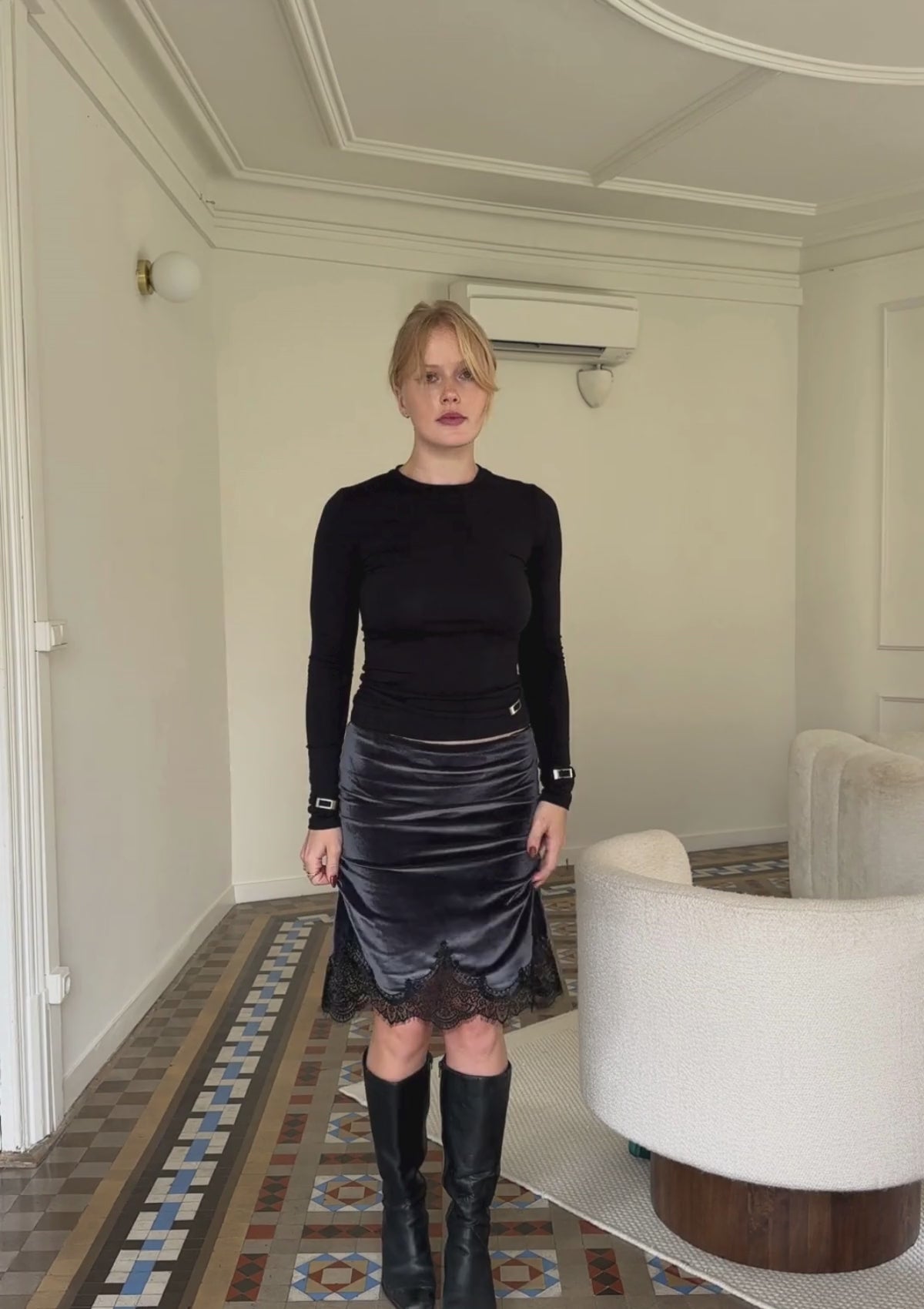 A soft velvet skirt with delicate lace trim and a subtle shine. Crafted with elastic comfort and a side zipper for an easy fit. The fabric gently adapts to your body — feminine, timeless and effortless.