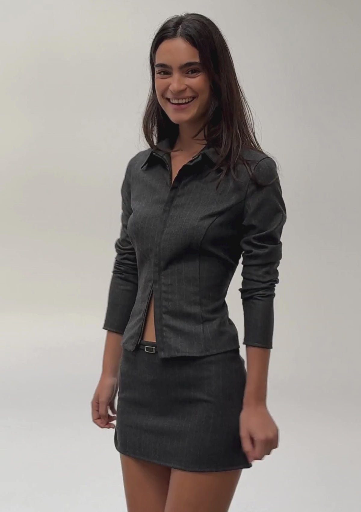 A pinstripe mini skirt with a movable metal buckle and an invisible side zipper. Non-stretch fabric with a flattering, fitted shape. Can also be worn as a top — versatile and bold at once.