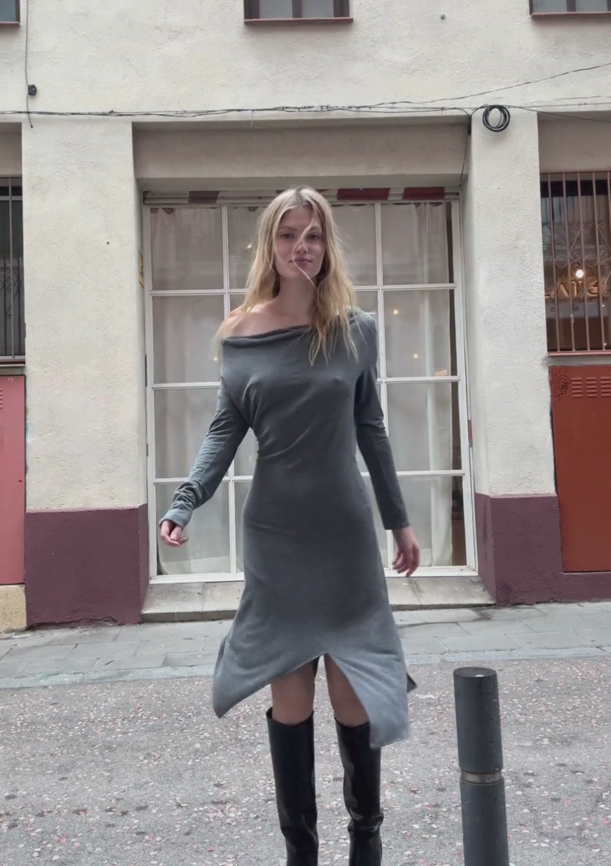 A soft draped dress made from ultra-soft, stretchy fabric that moves effortlessly with the body. The cowl neckline and asymmetric hem create a naturally fluid silhouette. Can be worn multiple ways — off the shoulder, draped, or boat neck — adapting to your mood and movement.