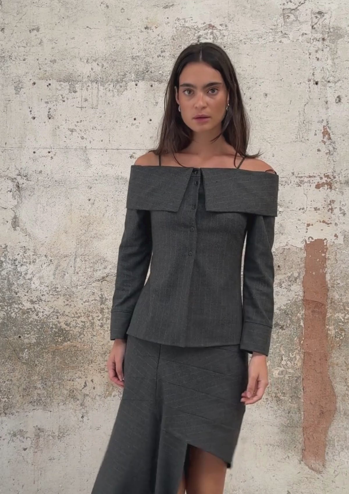 A structured pinstripe top with front buttons and thin straps that can be hidden inside. Made from a non-stretch fabric that fits tightly around the chest to create a sculpted, flattering shape. Consider sizing up if you prefer a more relaxed fit. It can be worn both ways.