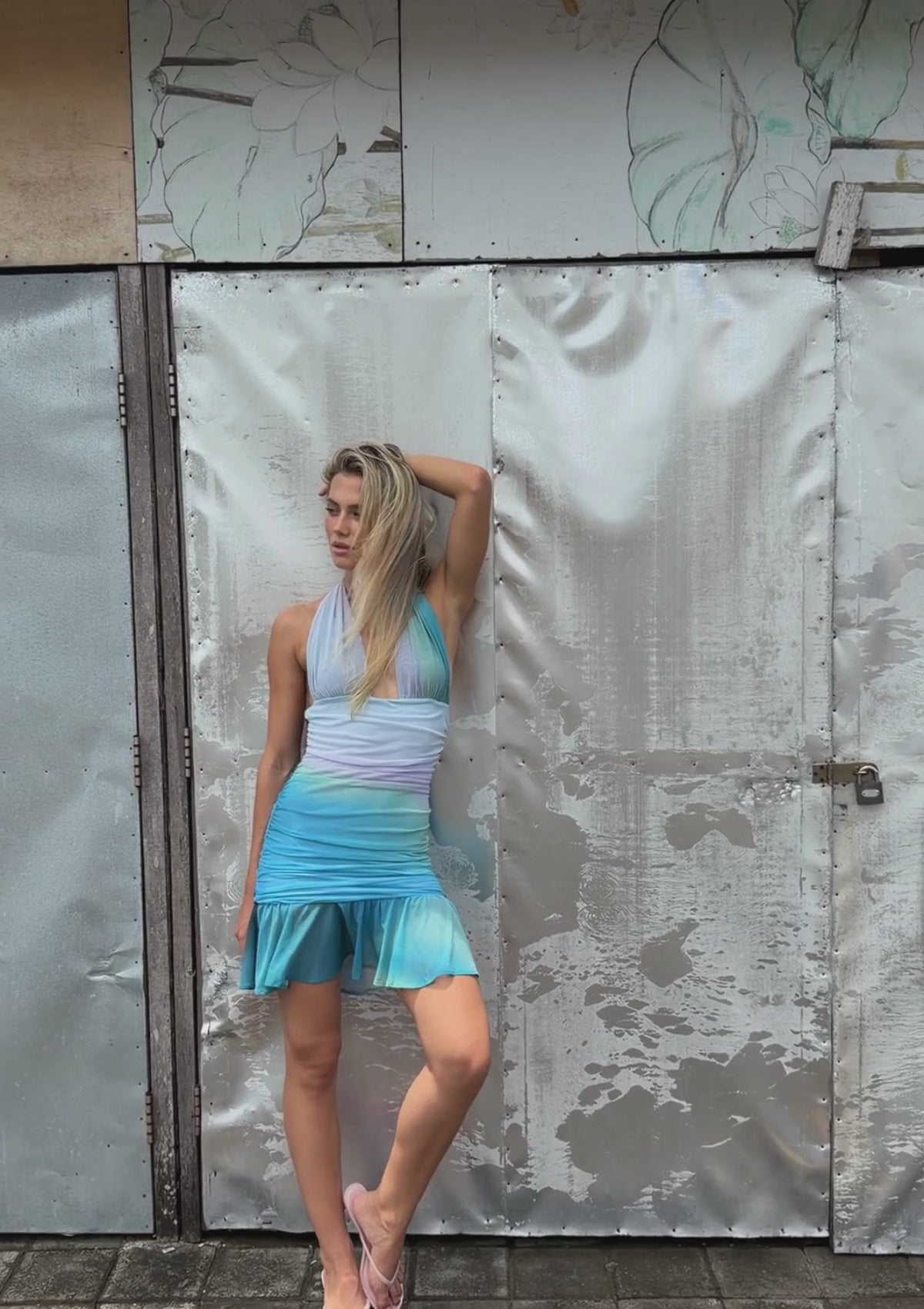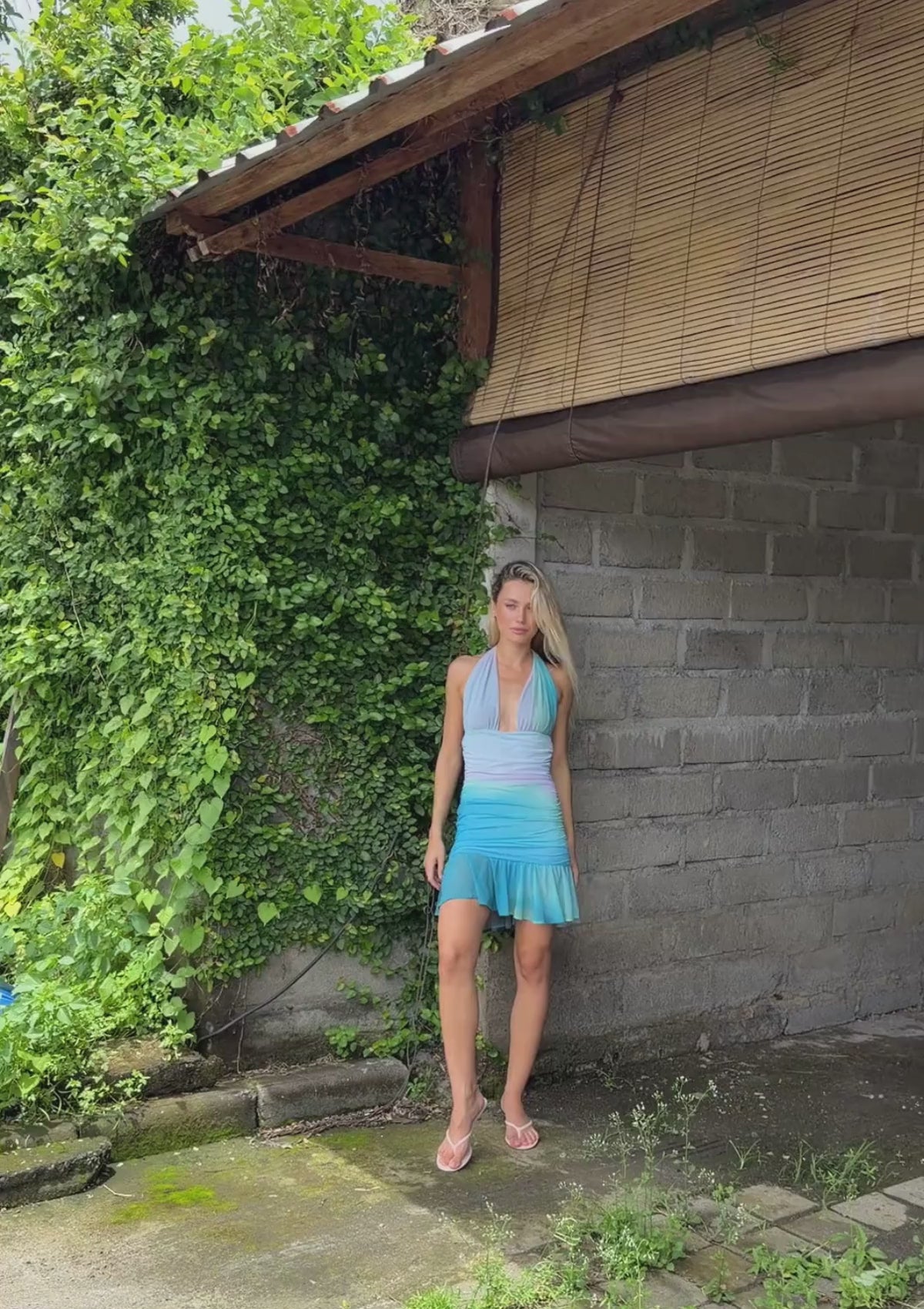 The Solita Dress is crafted in lightweight mesh with a halter neckline and an open back that ties delicately at the neck. It features a softly draped bodice that enhances the silhouette, while the fitted shape gently contours the body.